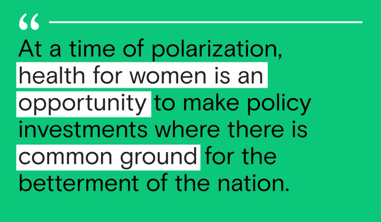 Design policies that enable women to get all of their health needs addressed, whether related to reproductive health, overall physical health, or mental health. Women’s health is full mind and body health, and nothing less.