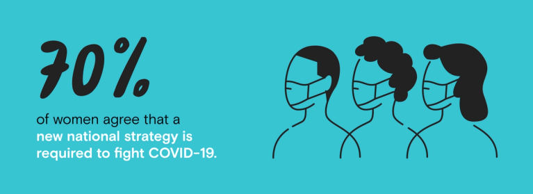Despite staggeringly different levels of COVID-19 contagion and impact among demographic groups, 70% of women agree that a new national strategy is required to fight COVID-19. Moreover, women in the study also show consensus regarding the policies and actions in such a strategy, like social distancing and mask-wearing, with the vast majority preferring a stricter approach. Specifically, the majority of women believe that: