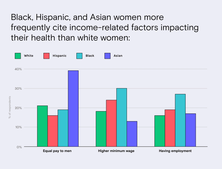 Still, there are noticeable differences in what were named as the most contributory factors to health when breaking down the results by race and ethnicity, highlighting disparities among certain minority populations. Black, Hispanic, and Asian women more frequently cite income-related factors, such as a higher minimum wage, having employment, or