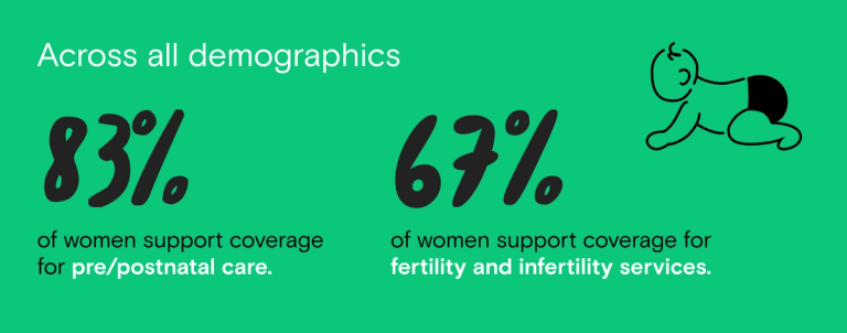 Conversely, women across all demographics consistently support coverage for pre- and post-natal care as well as fertility treatments, with a higher level of support yet among single Black and Hispanic women for the latter.