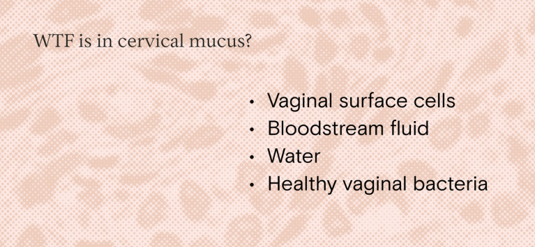 Cervical mucus is fluid that’s secreted from the glands in the cervix (the lower part of the uterus that opens into the vagina, specifically. It mixes with arousal fluid (lubrication) and water to make what we know as discharge. The mucus is made up of healthy vaginal bacteria, cells that have been shed from the vaginal surface, and a tiny amount of fluid that leaks across from the bloodstream. Cervical mucus is comprised of between 90 - 98% water — and on average, the body produces 1-3 mL of it every day.