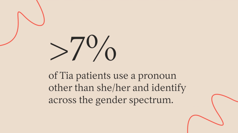 As a Tia member, your gender identity will be affirmed and respected. Before you ever meet with one of our providers, you’ll fill out a detailed health record form that will tell us important details about your identity, including your gender, pronouns, and sexual orientation, so we can ensure that we are referring to you correctly and asking appropriate questions about your health and life experiences. More than 7% of Tia patients use a pronoun other than she/her and identify across the gender spectrum. Where appropriate, we provide our patients clinical context as to why it's important for a provider to understand this information; it’s core to our care philosophy, specifically, our commitment to personalized care and treating the person, not (just) the patient. We recognize the multitude of ways that a patient’s lived experience influences their health and access to care: clinically, psychosocially, and experientially. All Tia providers undergo training on inclusive care as well as inclusive language, protocols, and the individualized, connected model of Tia care that centers our patients and gives you full agency over your health care.